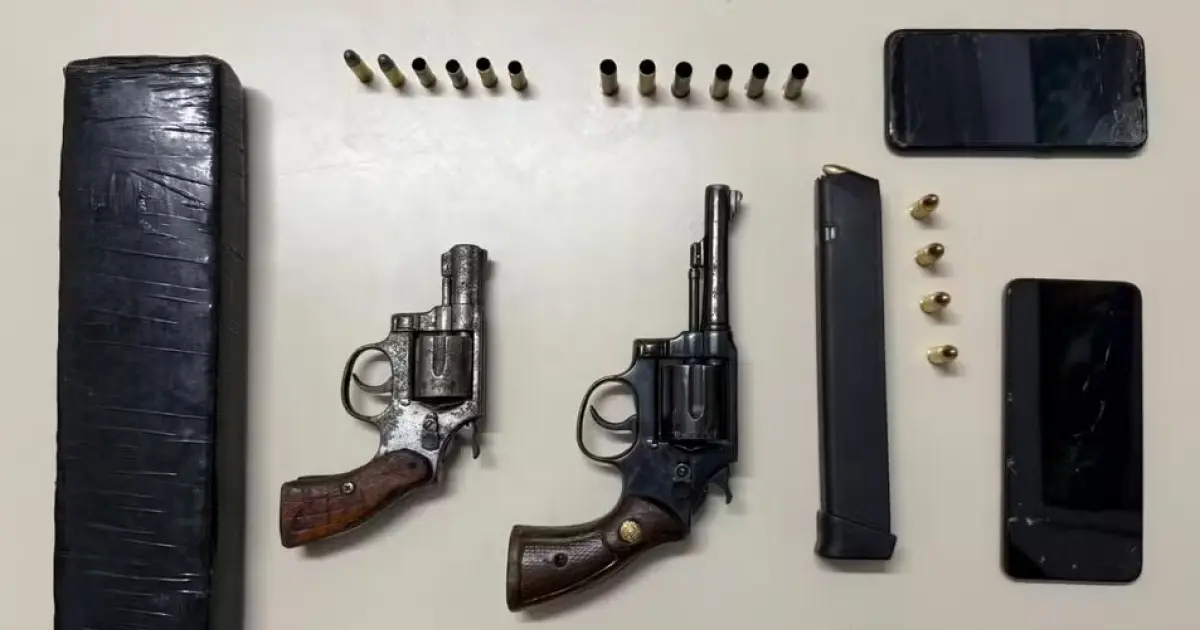Com os suspeitos, a polícia apreendeu duas armas de fogo, um revólver calibre .38 e outro calibre .32, além de um carregador de pistola estendido e cerca de 1 kg de maconha.