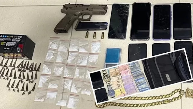 Durante a ação, foram apreendidos uma pistola calibre 9mm, munições, substâncias análogas à cocaína, uma balança de precisão, dinheiro em espécie, aparelhos celulares, além de outros materiais relacionados à atividade criminosa.