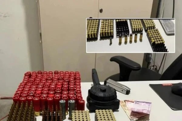 Diante da situação, as guarnições foram até o imóvel informado, onde encontraram carregadores de pistola, uma porção de substância aparentando ser maconha e diversas munições de vários calibres, inclusive de uso restrito.