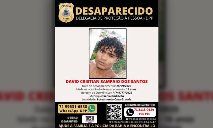 O desaparecimento de David Cristian Sampaio dos Santos, o jovem conhecido como Dedê, de 18 anos, continua cercado de mistério e agora conta com o apoio de uma equipe especializada. A Delegacia de Proteção à Pessoa (DPP) assumiu o caso, antes acompanhado pela delegacia de Serrolândia, intensificou as buscas, divulgando uma nova imagem do rapaz para tentar obter informações que possam levar ao seu paradeiro.